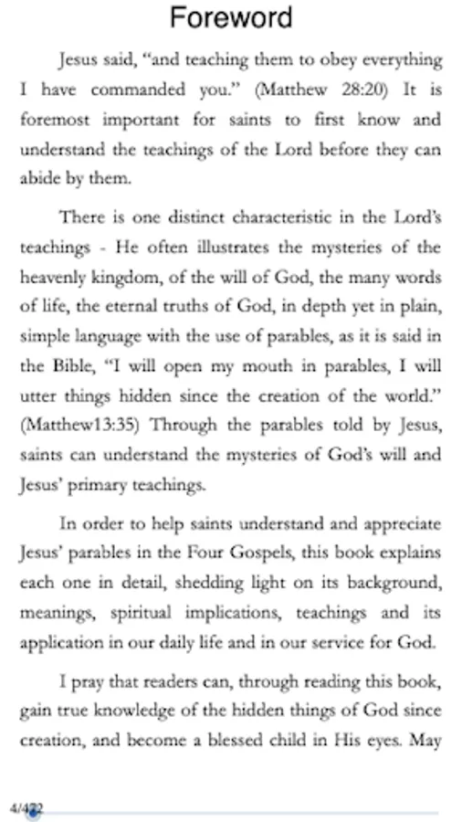 In order to help saints understand and appreciate Jesus’ parables in the Four Gospels, this book explains each one in detail, shedding light on its background, meanings, spiritual implications, teachings and its application in our daily life and in our service for God.