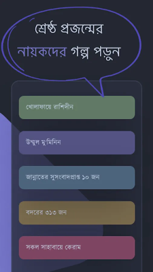 The Story of the Companions is an Islamic app. This Islamic app contains the biographies of about 200 Sahaba who witnessed various important events in the history of Islam. From this Islamic Golpo, one can read the biographies of about 200 Companions, including the well-informed Companions of Janat, Umm al-Muminin and the Companions of Badr.