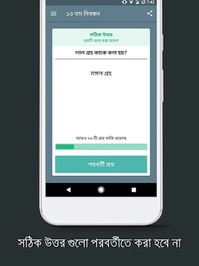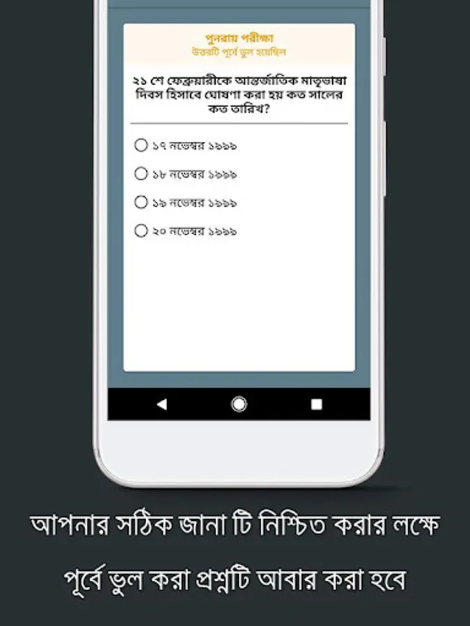 ✔ কেননা, আপনি কোন প্রশ্নের উত্তর ভুল করলে এই এ্যাপ আপনাকে সঠিক উত্তর জানানোর পাশাপাশি পরবর্তীতে আবারো সেই প্রশ্ন করবে আপনার শিখে নেওয়াটা নিশ্চিত করার জন্য।