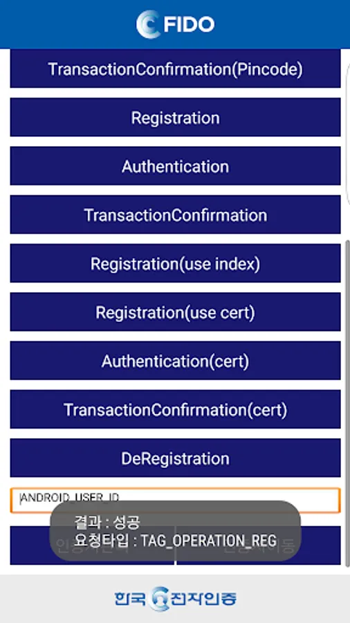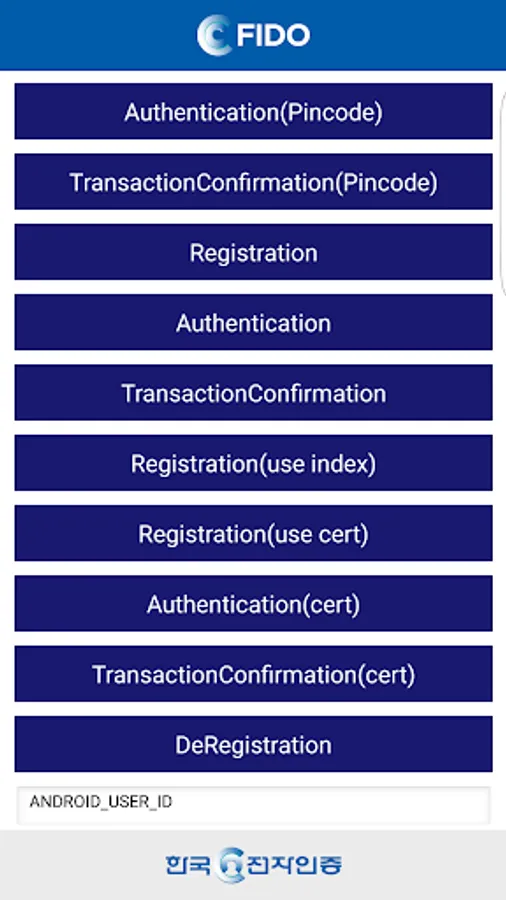 This Bio Certification Center application is an application for FIDO certification in Korean electronic certification. FIDO Register / FIDO Transaction Confirm / FIDO Deregister You can copy FIDO Register / FIDO Transaction Confirm / FIDO Transaction Confirm / FIDO Deregister as well as four operations.
