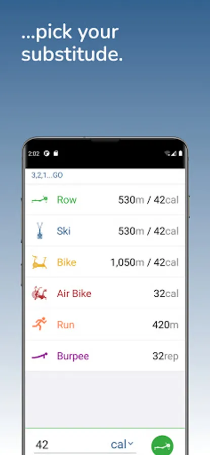 No Rower? No Skierg? No Air Bike? ... no problem! Pick your favored movement substitution in seconds and 3...2...1...go!
