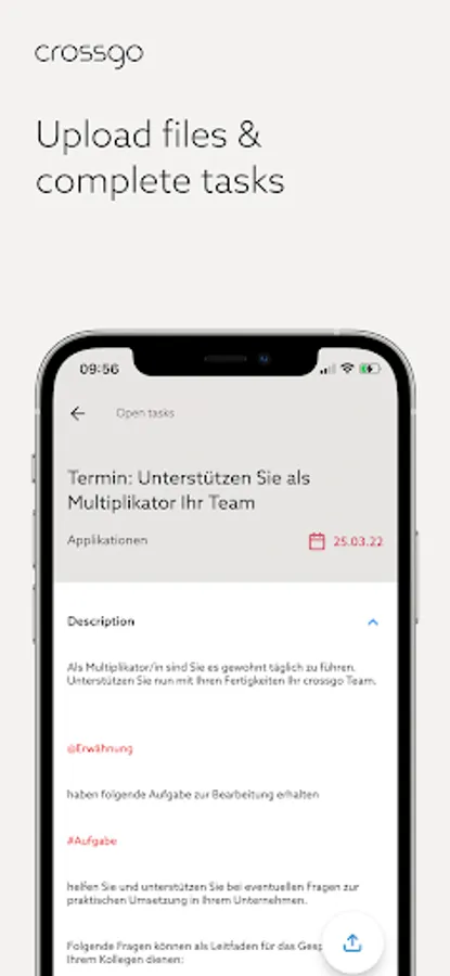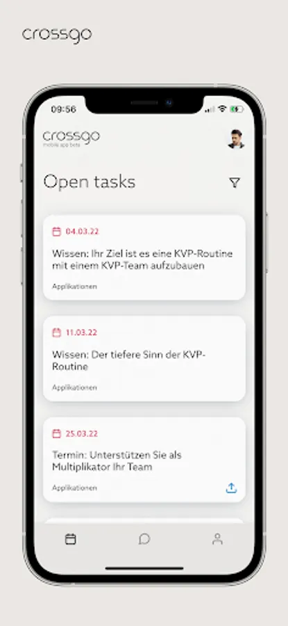 crossgo is a self-consulting platform. Teams and employees get access to easily understandable methods and tools of company development and the blueprints for practical execution. Experienced crossgo experts support and supervise the usage in the company. Thanks to crossgo everyone can continuously contribute to the success of the company and the improvement of one's workplace. The crossgo mobile app gives you access to services from the crossgo web app - simply through your smartphone