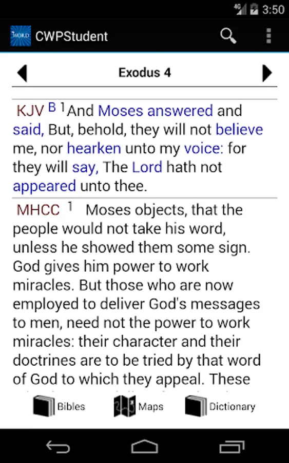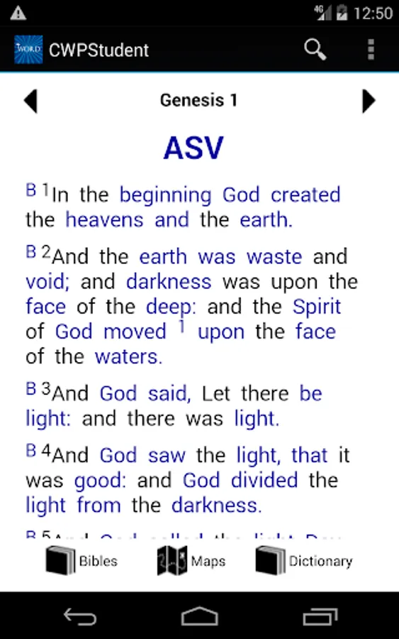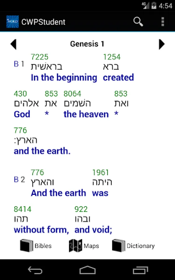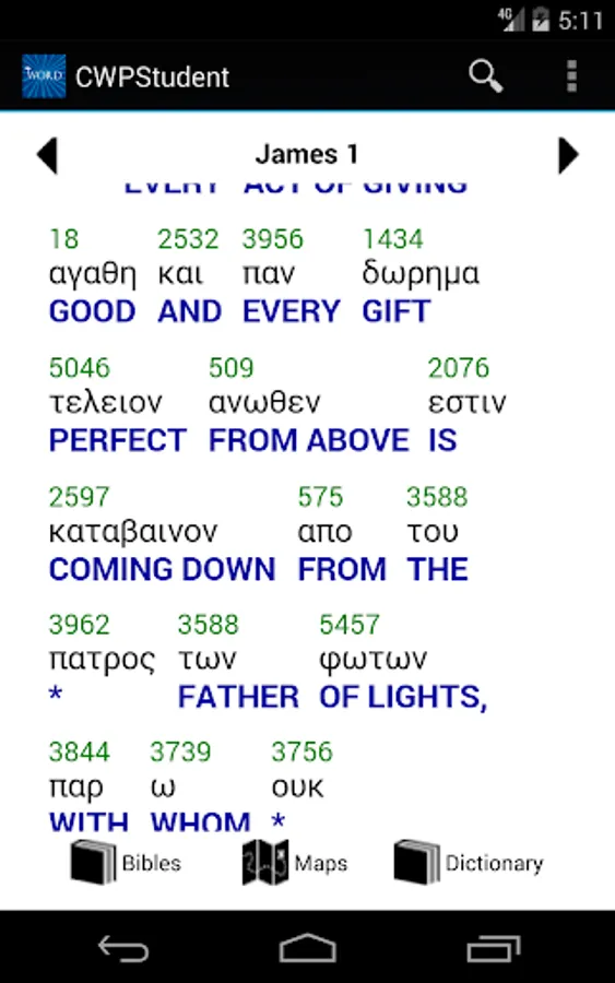 All content is "touchable." Touch a highlighted word and see the Greek or Hebrew word used to translate to the English word in the passage. Change font size, Strong's word colors, bible presentation, and more.