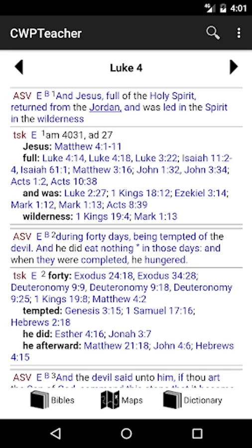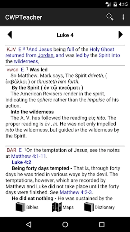 Advanced Bible Study Utility. Includes Smith's Bible Dictionary, Interlinear, Septuagint, ASV, KJV, WEB, Morphology, Barnes, Gill, Matthew Henry Concise Commentary, Scofield, Vincent Word Study (VSWNT), Treasury of Scriptural Knowledge (TSK), Maps, and the ability to add your own notes keyed to book,chapter, and verse.
