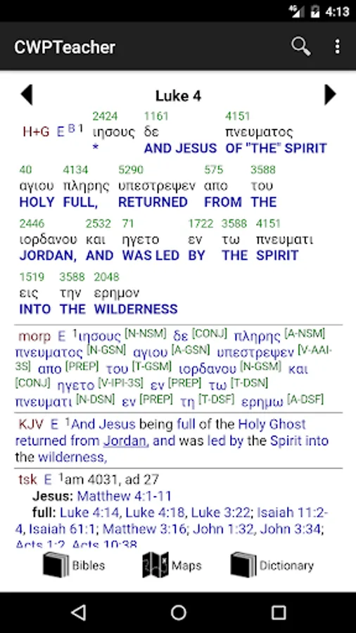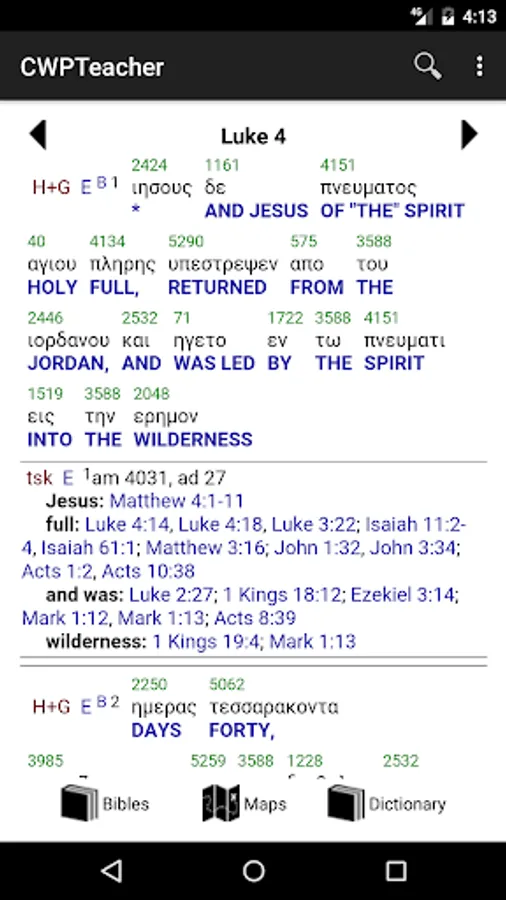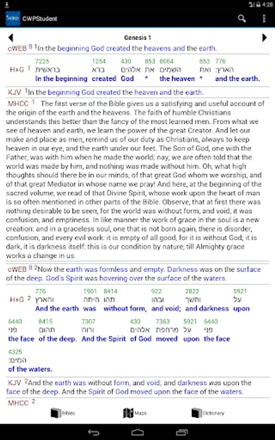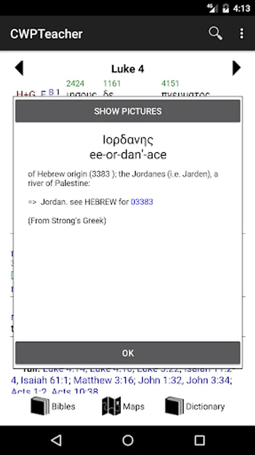 All content is "touchable." Touch a color coded word and see the Greek or Hebrew word used to translate to the English word in the passage. Change font size, Strong's word colors, bible presentation, and more. Also included is around 300 pictures keyed to the original language. Touch an underlined word to start the process.
