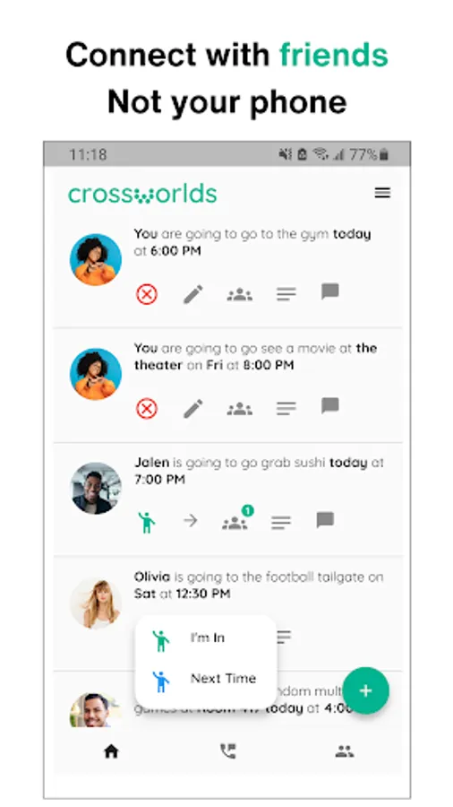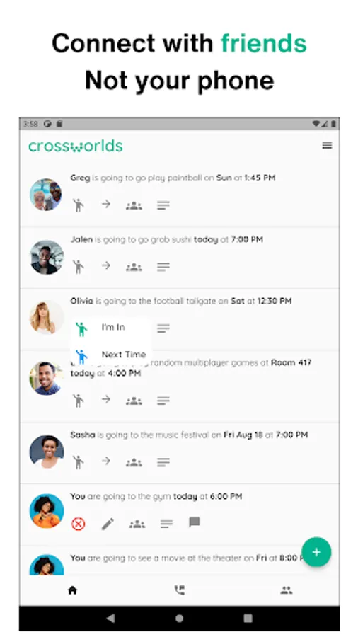 With Crossworlds, you can send quick, casual invites to the people in your life, commitment-free. Need a partner for your afternoon hike? Or someone to catch that new movie with? Send out an open invite or accept one from a friend!