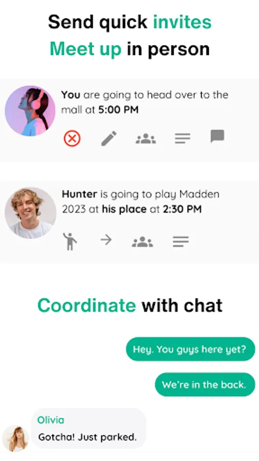 • Use the app’s real-time text messaging to coordinate invites, as needed