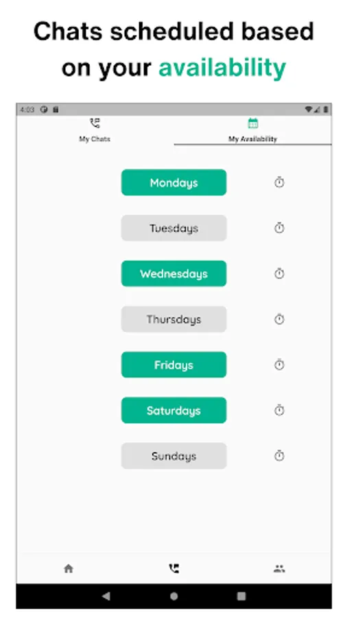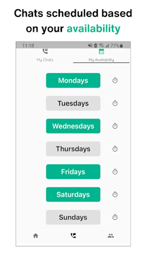 • Every day, Crossworlds will try to schedule you a 15-minute chat with one of your friends (if you’ve enabled this feature for that particular friend). If you've told us you're available that day, you'll get a notification in the morning about who we've matched you with and at what time.