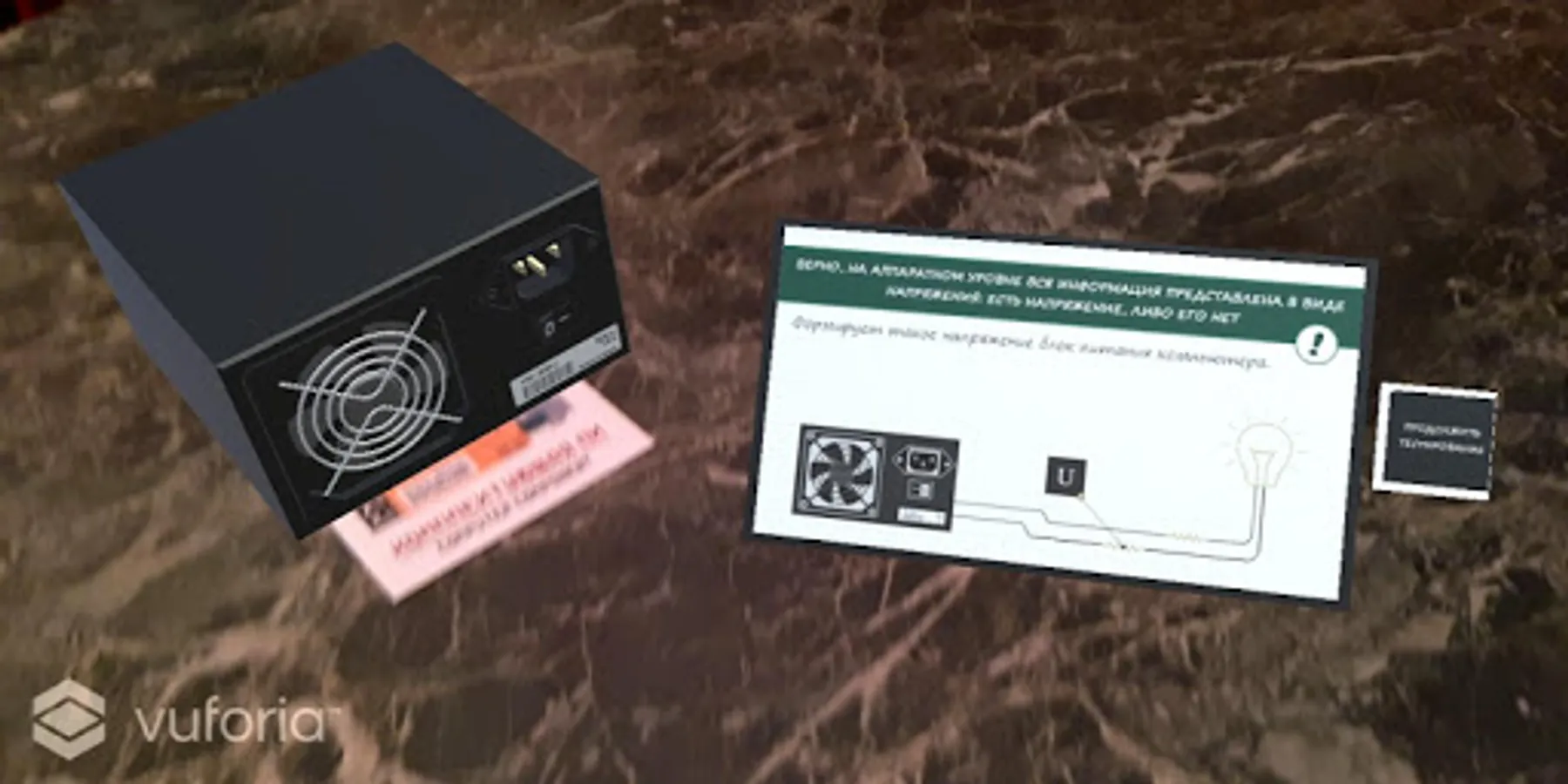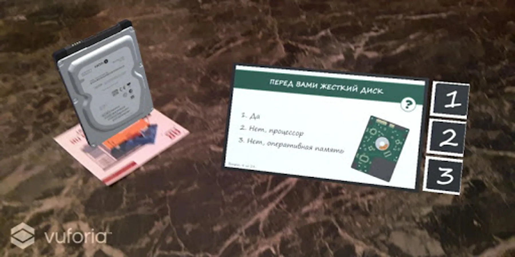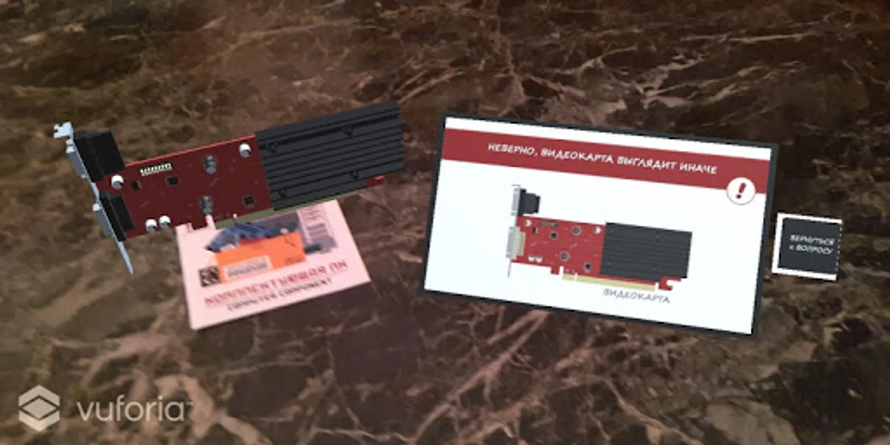 - To pass a training test with elements of augmented reality, you need to point the camera of the device with the running application at the same time on two cards: “Modern computer device” and “PC component”, after which a test with buttons “1,2,3” will appear - for