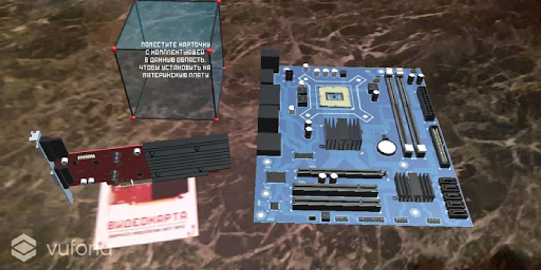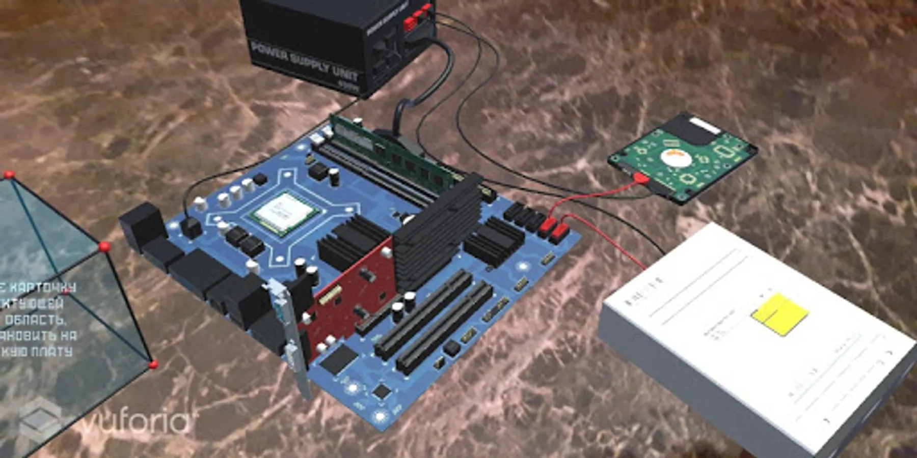 - To Assemble a computer in an augmented reality environment, you need to point the camera of the device with the running application at the “motherboard” card, then place the necessary computer component (Hard disk, processor, etc.) in a transparent zone in the form of a cube and it