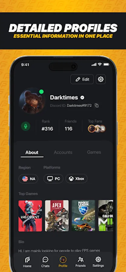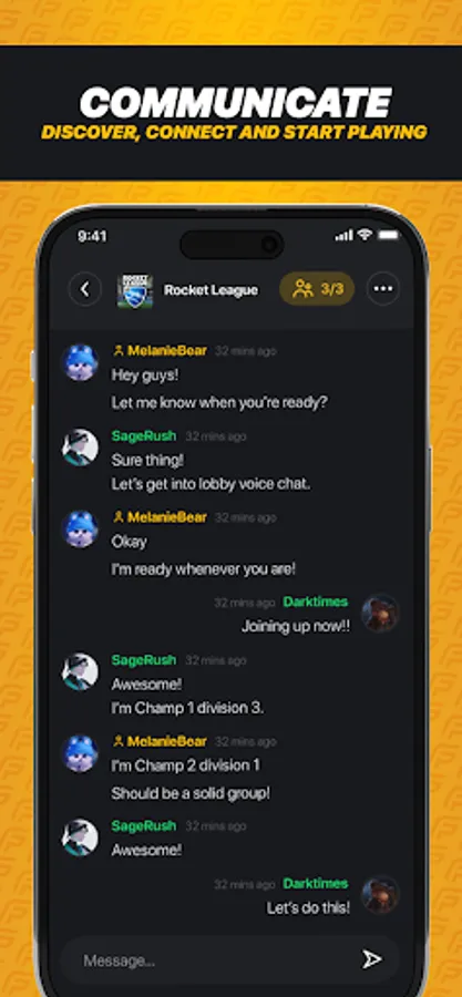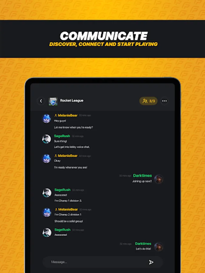 Once you've found your perfect LFG, kick off your team and go for the win. And while you're waiting for the match to start, PlayerFinder offers in-app chat with your squad, so you can stay connected and strategize together. You can also easily see your squad's gaming and social links so that you can connect with them in-game and out of the app.
