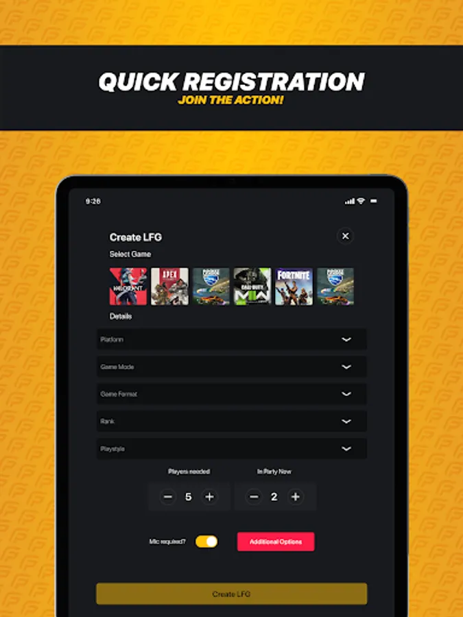 PlayerFinder is designed to help you quickly filter LFGs based on game, format, skill, and other critical player-matching criteria. With just a few taps, you can find the perfect group to join and start playing your favorite games quickly. Whether you're into first-person shooters, strategy games, or sports simulations, PlayerFinder has you covered.