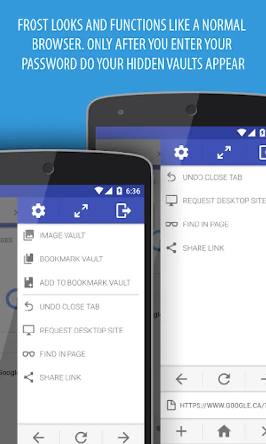 Frost+ is the best private tabbed web browser for Android, with a hidden, password protected image and bookmark vault as well as extensive privacy features.
