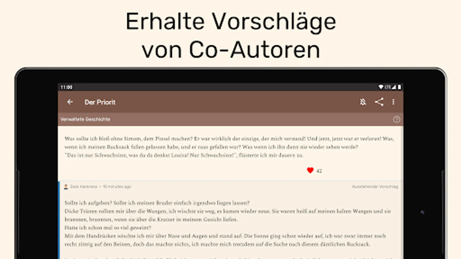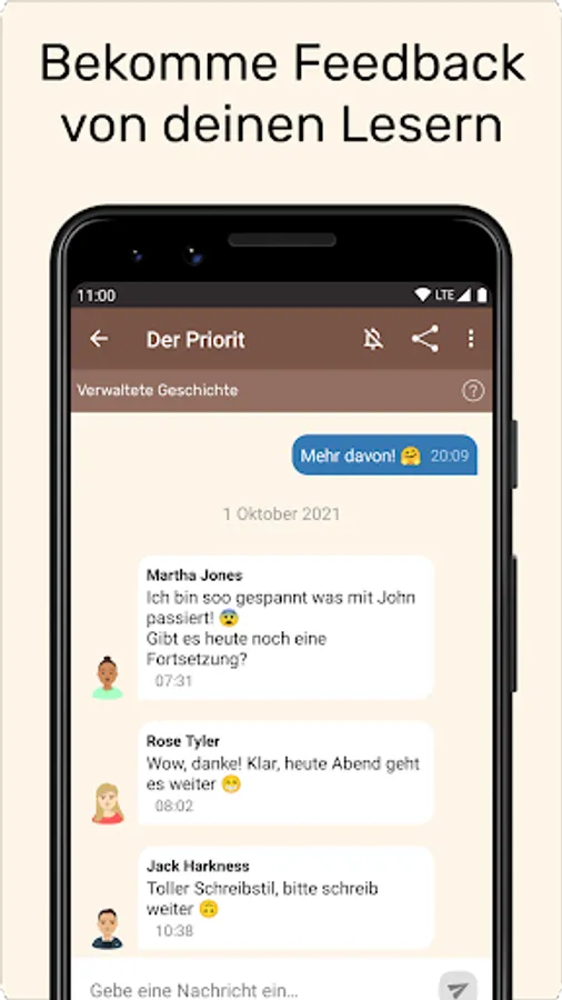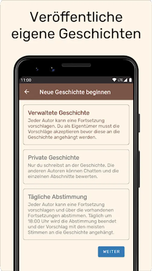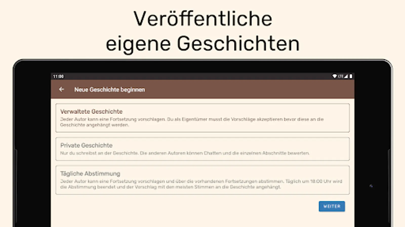 Not the right one? It doesn't matter! After just one day, you can start your own story. Think of a topic with a suitable title and write a beginning. And it beginns! The other users can now participate in your story.