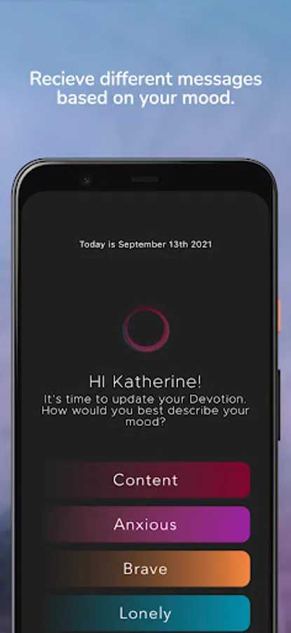 Devotion asks for your pronouns as a way to create more intentional affirmations. You can then switch between four moods (Brave, Content, Anxious, or Lonely) at any time to customize the tone of the messages you receive.