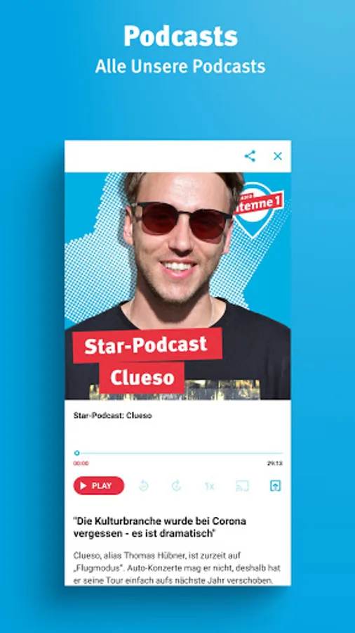 Back to the 80s or 90s? Rocky in the morning or rather relaxed in the evening? The current top 40 or the best movie hits of all time? We have it all in the app: From Top 40, 80s, 90s, Rock to Soft & Lazy, to our Plus channel and antenne 1 Neckarburg Rock & Pop and many more. Of course, our app also offers all of the regional broadcasting routes from Hitradio antenne 1: Stuttgart, Göppingen, Reutlingen, Heilbronn and Pforzheim.