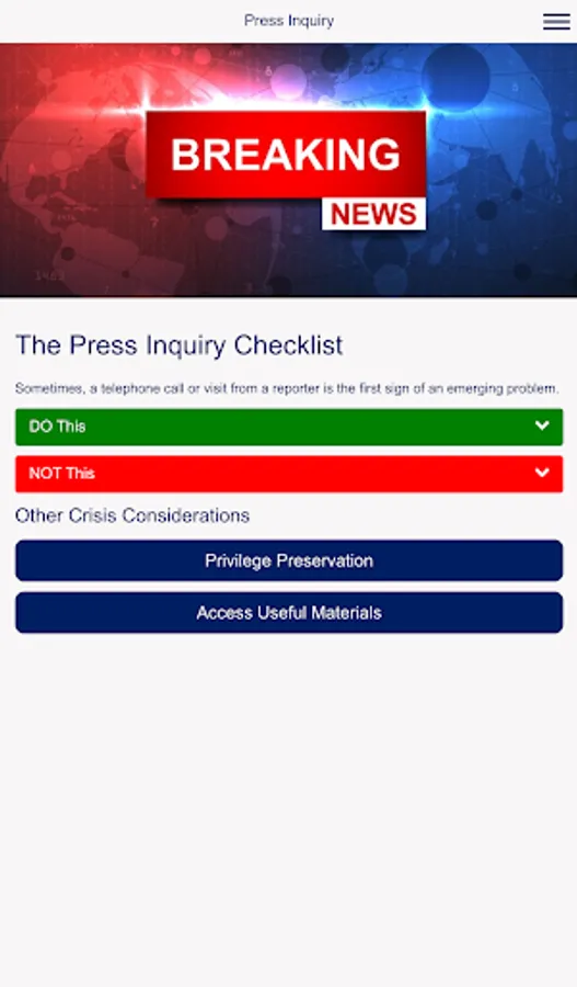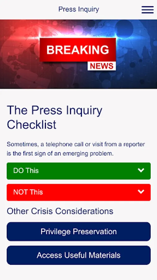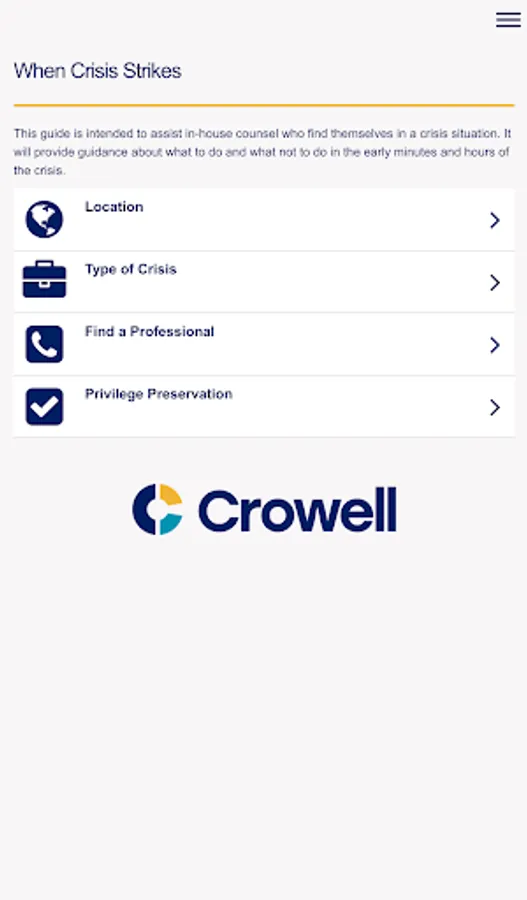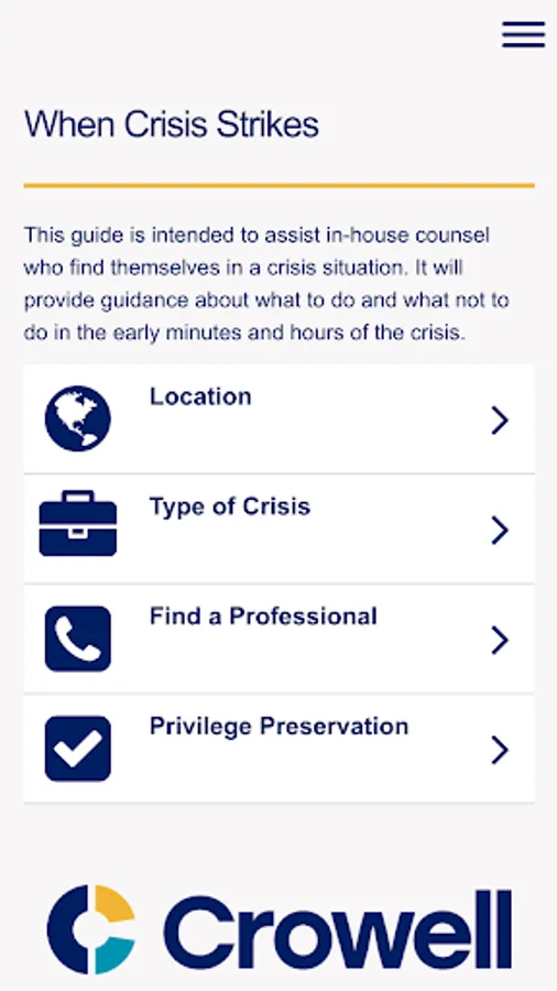 When crisis hits, businesses leaders across the globe turn to Crowell & Moring for advice on navigating government and internal investigations. Our Crisis Response App suite of easy-to-use checklists, sample forms and other critical information provides best practices for navigating the dos and don’ts of a crisis.