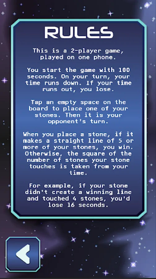For example, if your stone didn’t create a winning line and touched 4 stones, you’d lose 16 seconds.