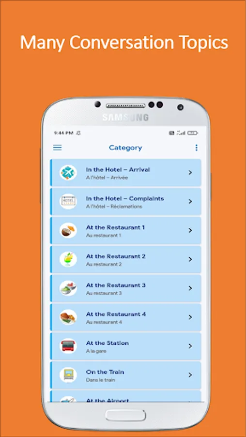 Topics for French conversation: Greetings, Conversations with friends, Basic sentences, Travel, Transportation, Hotel, Restaurant, Food, Shopping, Work, Business etc.