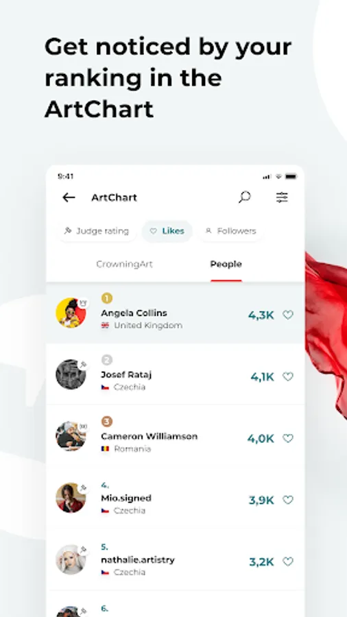 The "Art Chart" is a mirror of success - yours and all other users of the platform. Thanks to a special filter, you can easily find out the location of artists or individual contributions in specific countries, art categories, or according to evaluation criteria. Get to the forefront and your success in the field of art will surely make you famous!
