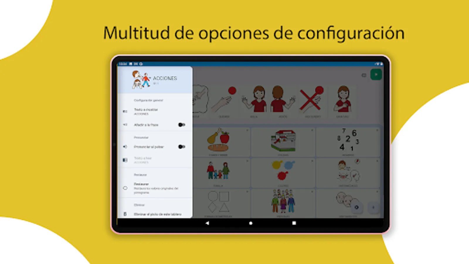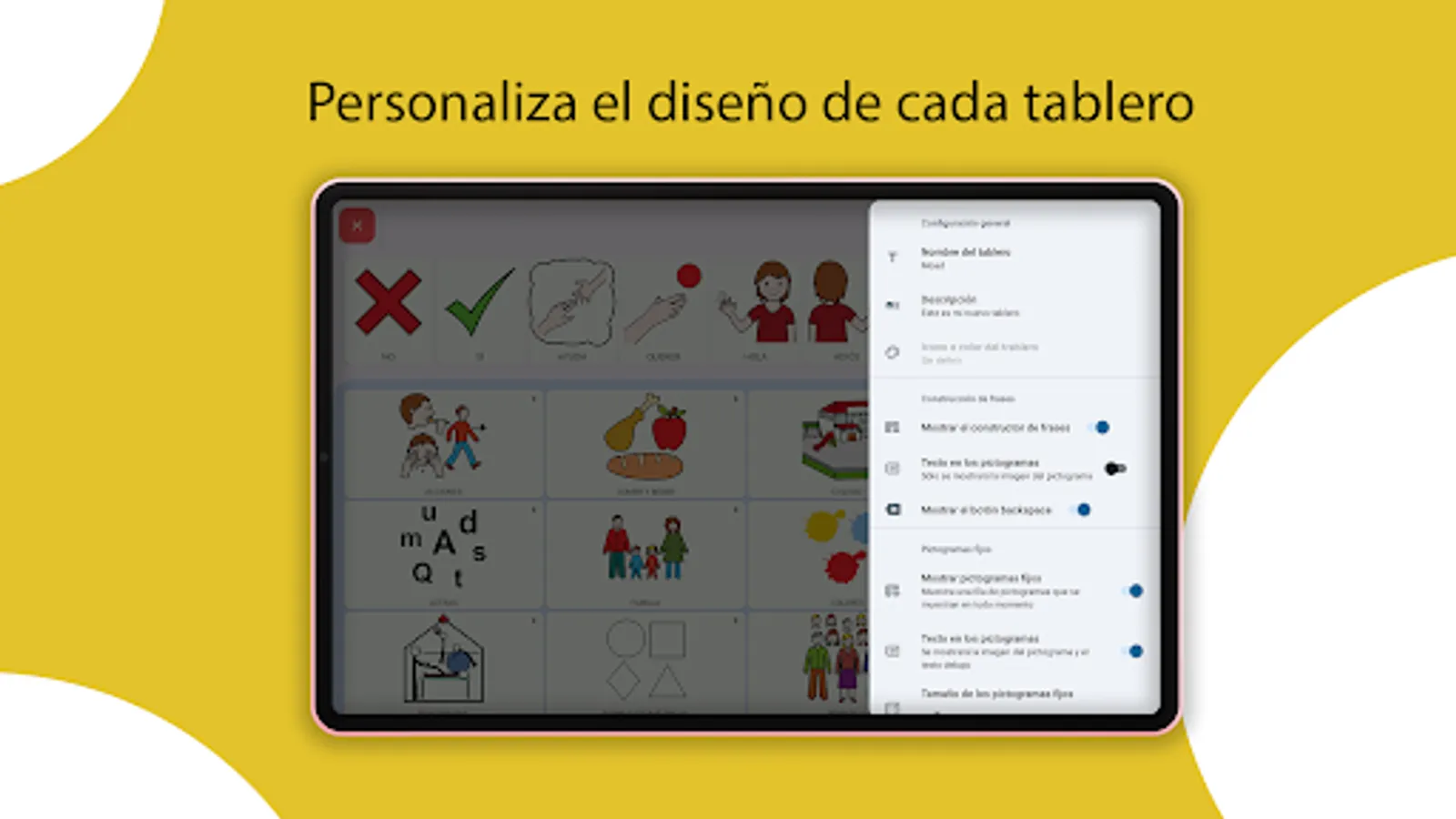 It allows you to configure any of the parameters (size, text, rows, columns...) of its three sections (phrase builder, fixed pictograms, or main pictograms).