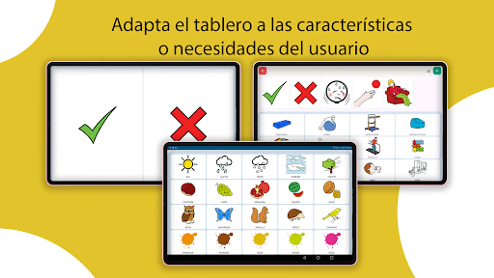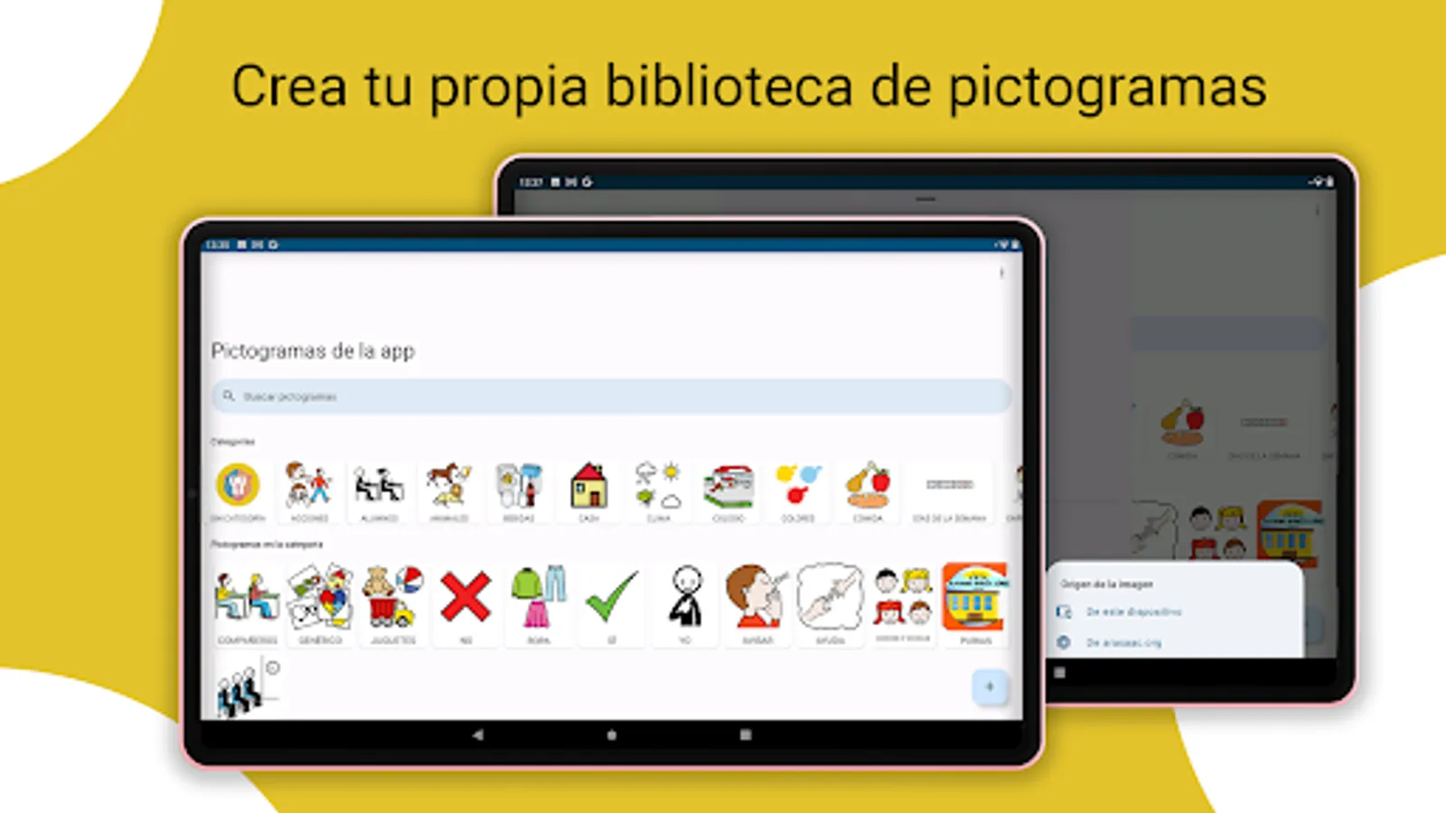 Larunda has its own library of pictograms that the user can organize, expand and modify, distributing each of them into categories according to their own preferences. Larunda can use ARASAAC pictograms or any other custom pictogram, with images downloaded from the Internet or photos taken with your own device.
