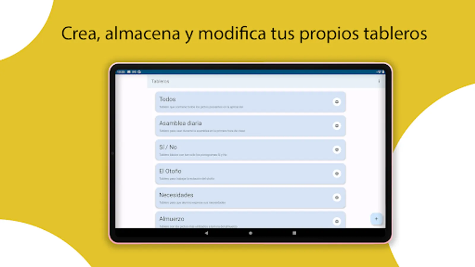 Larunda is organized into boards, so that you can create different boards, each one with a certain configuration and pictograms, depending on the use you intend to give it. Larunda includes sample boards that you can start working with, test, or delete.