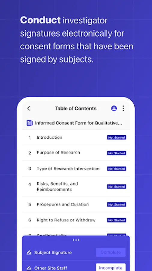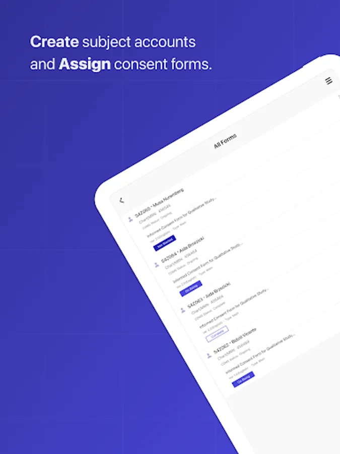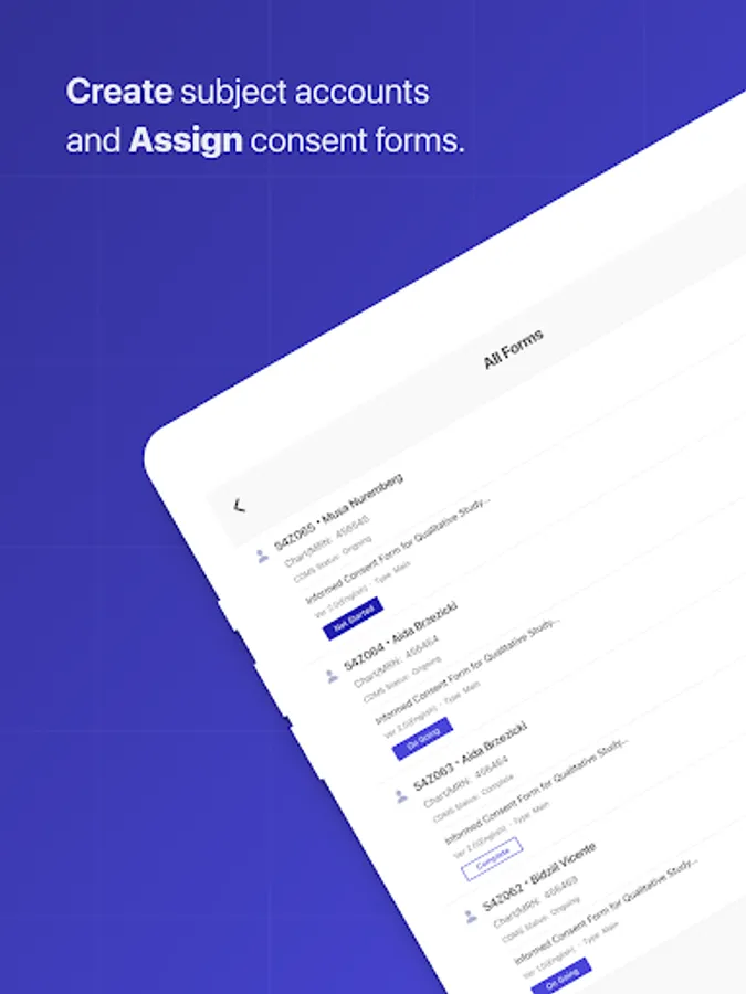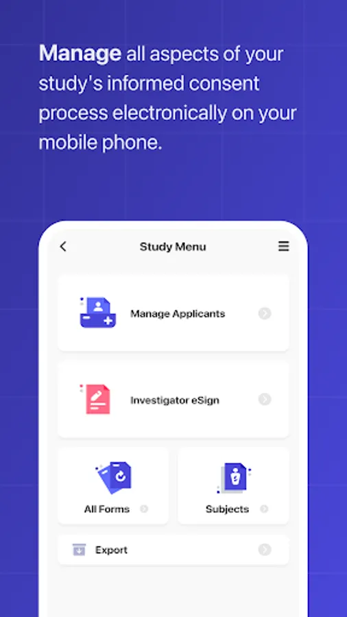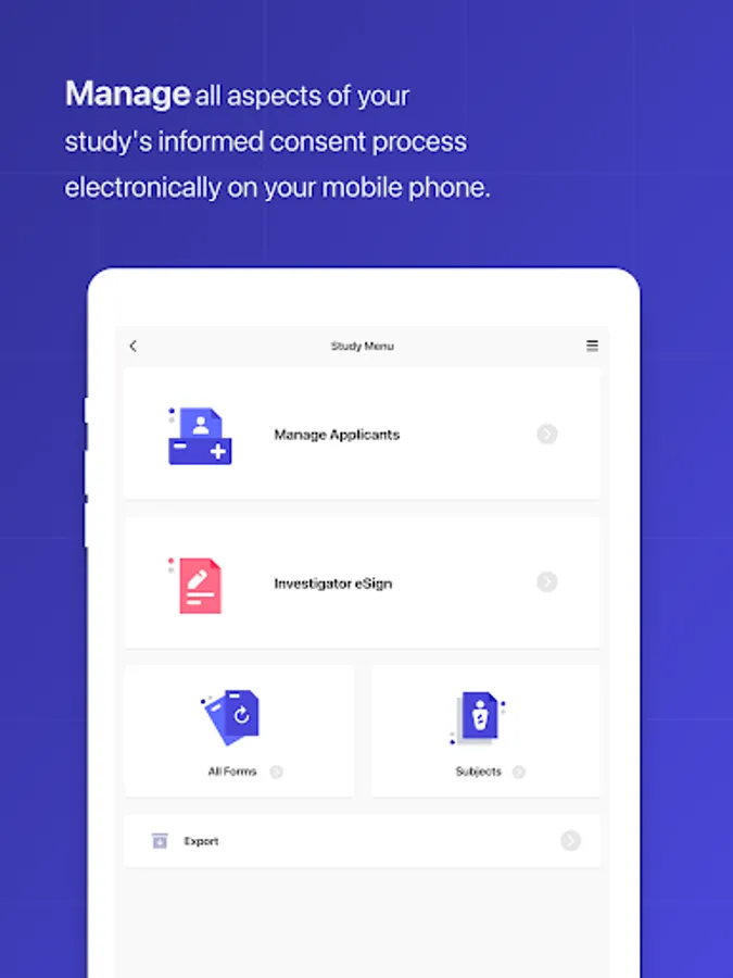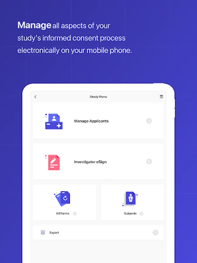 - Manage all aspects of your study's informed consent process electronically on your mobile phone.