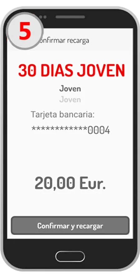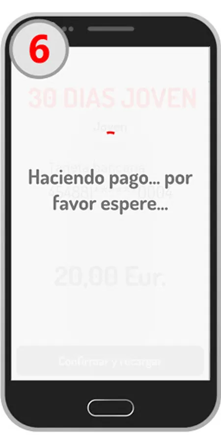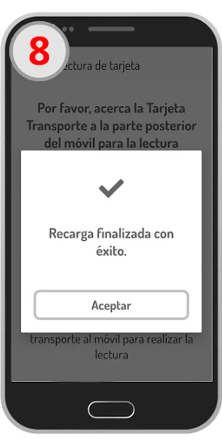 7. Once the payment has been made, the App will ask to bring the transport card to the mobile's NFC reader (on the back) to charge it.