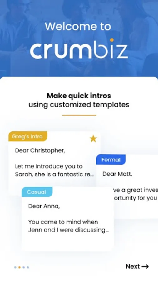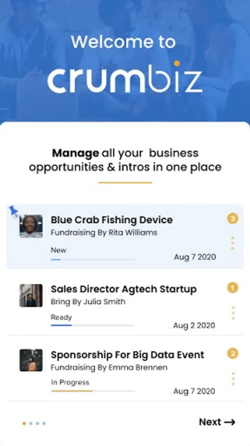 CRUMBIZ' mobile application is used to make quick on-the-go interactions including initial introductions and updating stages.