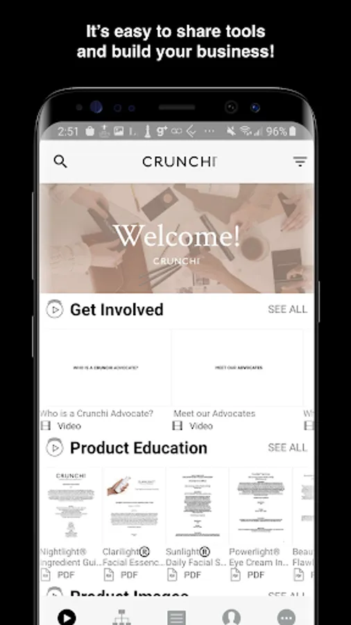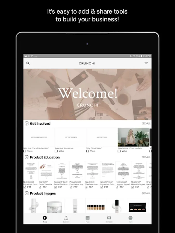 With the Crunchi Tools app, you can easily share your way to success with tools that create word-of-mouth buzz and complement belly-to-belly efforts! Connect with new contacts and interact with your team by sharing exclusive, corporate-approved tools. You’ll have a vast array of marketing materials like videos, images, and more—all right at your fingertips! The powerful, yet beautifully simple design, along with compelling tools, makes growing your business simpler than ever.