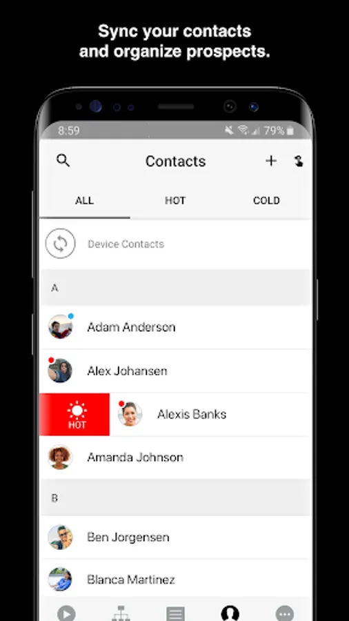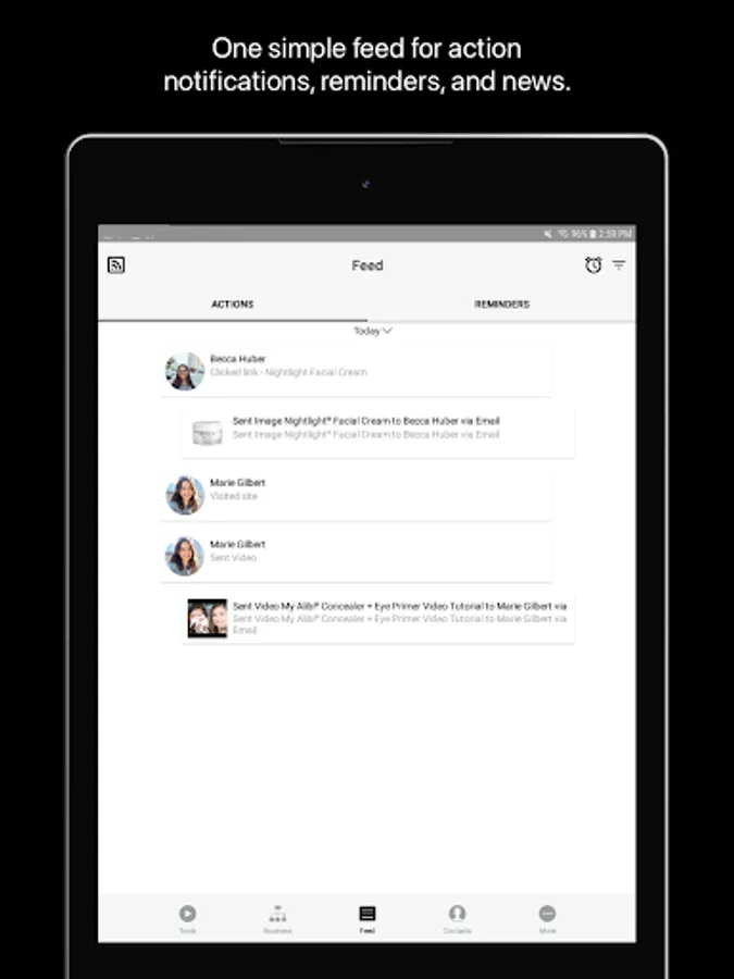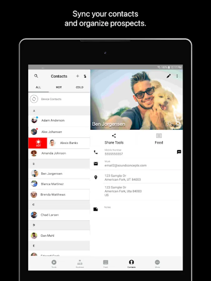 Contacts: Choose how to sync and manage your contacts. Swipe to sort them by interest level. You can make connections, add notes, or check out the Contact Feed to see the tools you’ve shared and contact actions.