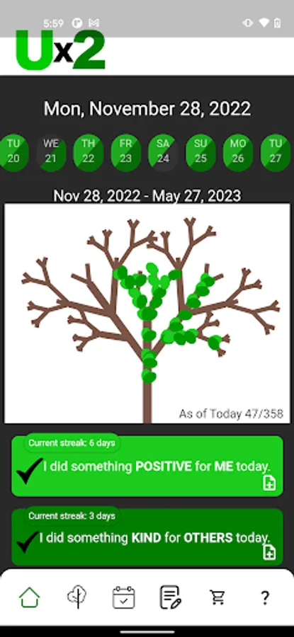When performed, you will click on the acts performed for the day. With each click you will graphically see your accomplishments - a leaf will be added to your tree. As your tree fills with leaves, you will “grow” as your tree grows -
