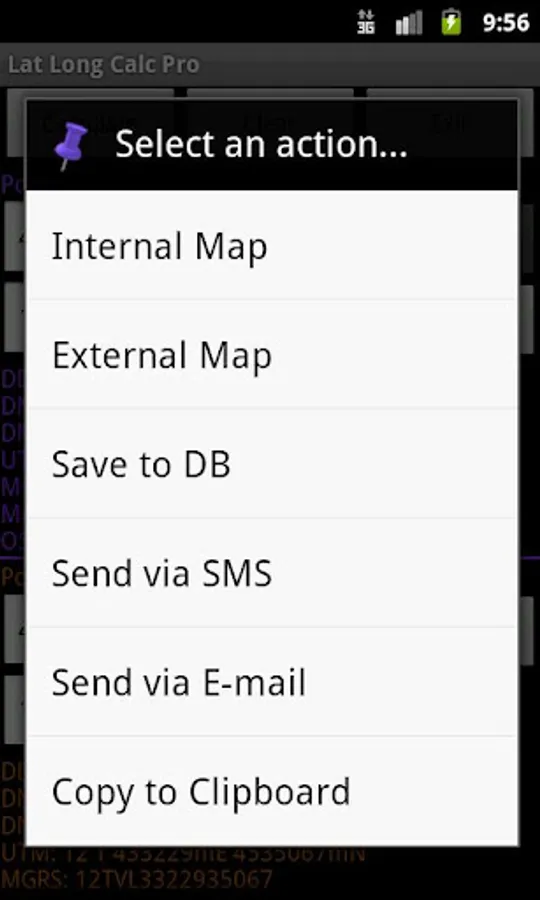 Long press on coordinate results to show on map, send via SMS or Email, copy to the clipboard, save to the internal database or use CompassNavi based Guide Me feature. Read help for more details. With Lat Long Calc Pro SMS Plugin you can receive points in GEO URI format via SMS texts. Share points with friends and co-workers.