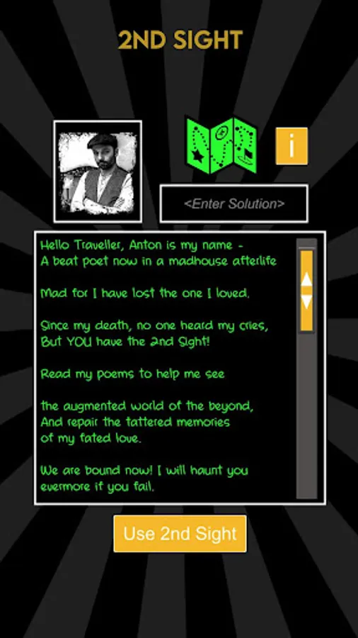 You have been bound to the spirit of a beat poet named Anton. Using your gift of 2nd Sight, you will embark on an augmented reality puzzle hunt through the streets of NYC. Reconstruct his shattered memories and solve the mystery of his lost love - or be haunted evermore.