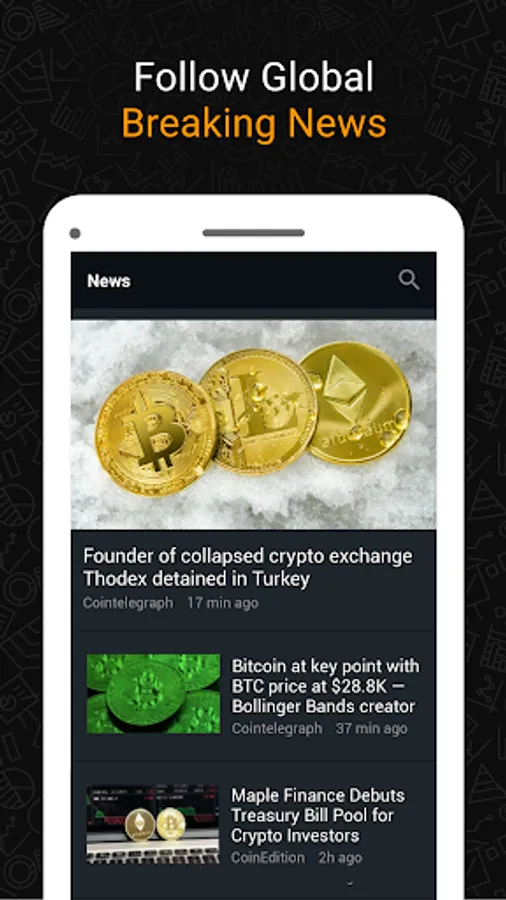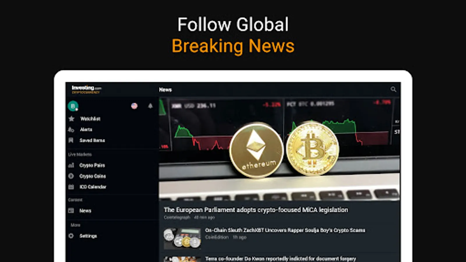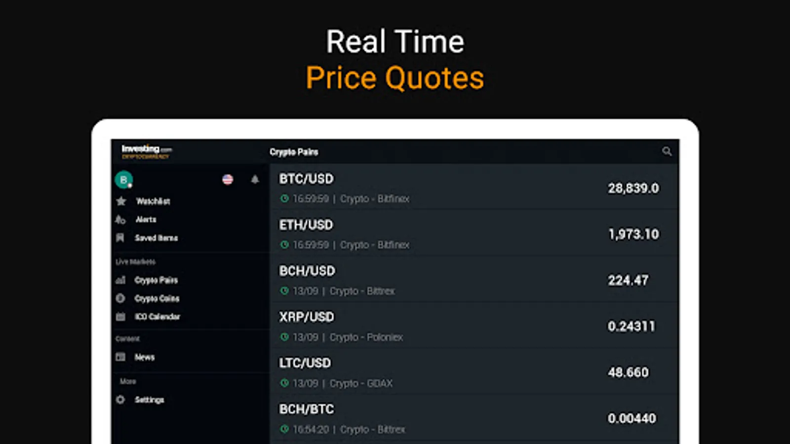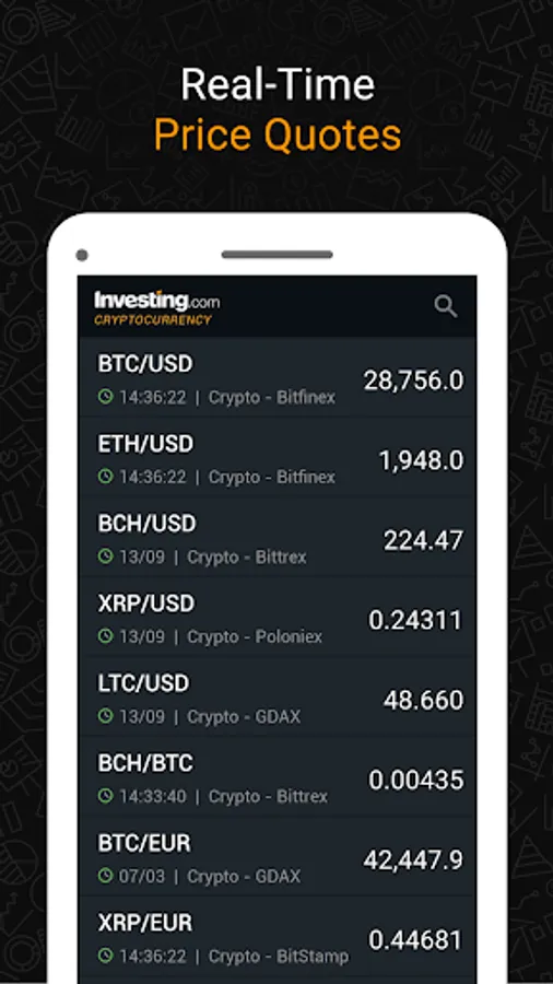 The Investing.com crypto app currently offers data from the following exchanges: