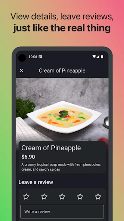 Please note that this is a fictitious app, and any resemblance to real restaurants or dishes is purely a coincidence. You will not be able to order real food through this app, nor will you be able to spend real money.
