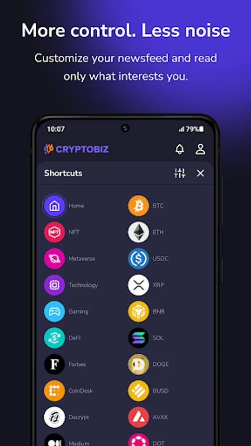 Tailor your news feed to your interests and preferences. CryptoBiz allows you to customize your feed based on your favorite cryptocurrencies, enabling you to focus on the news that matters most to you. Whether it's Bitcoin, Ethereum, or a specific altcoin, you'll receive the news you care about.