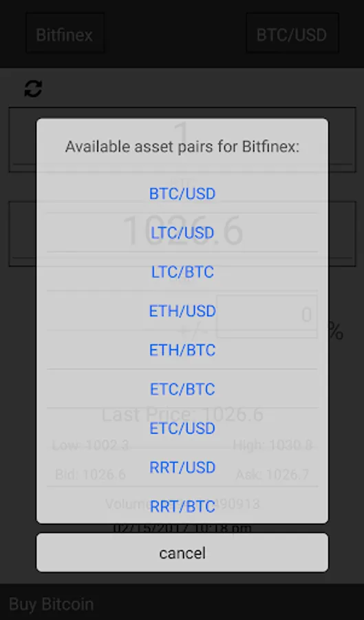 Available exchanges include Bitfinex, Bitstamp, Kraken, Poloniex and Bittrex. You can calculate conversions between dozens of asset pairs.