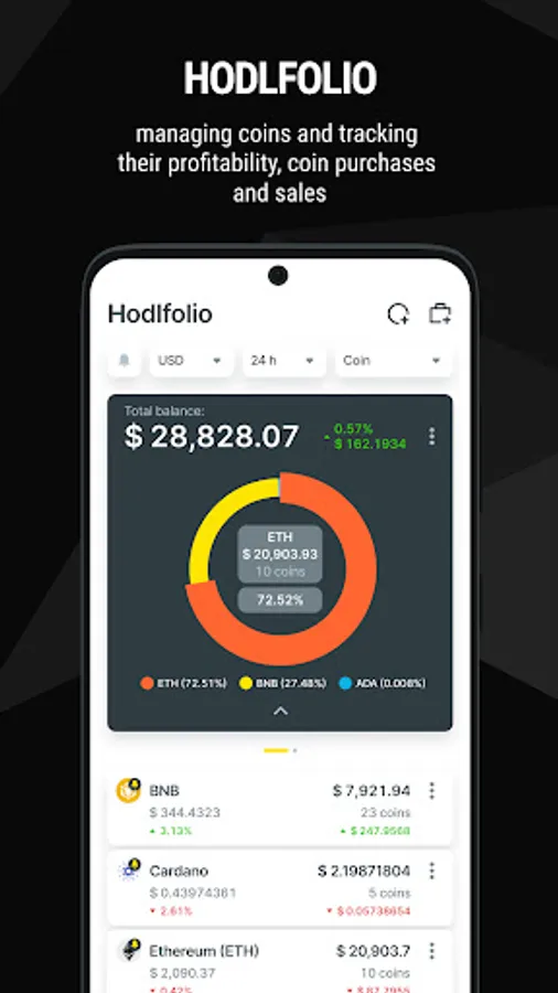 Hodlfolio displays both the overall balance and the value of each asset separately. You can select a period and calculate the profitability of holding coins. The portfolio total value can be displayed in fiat currencies and in cryptos.