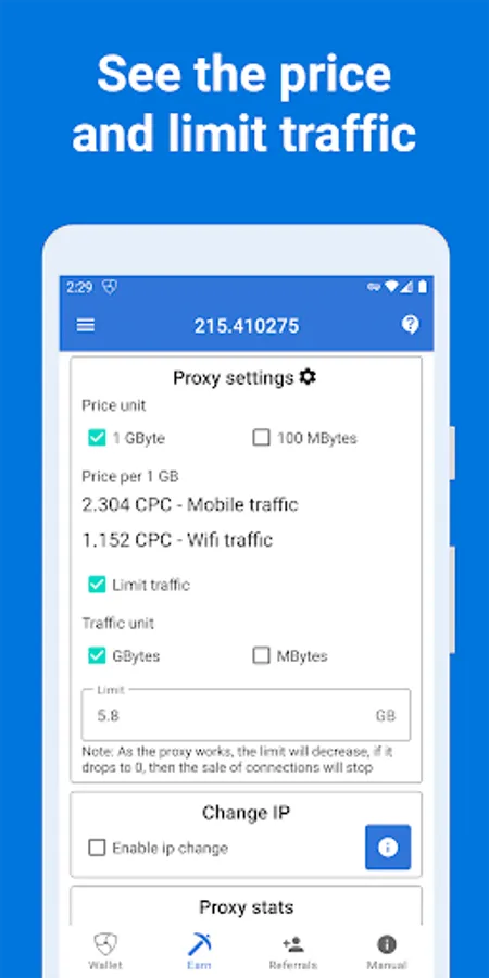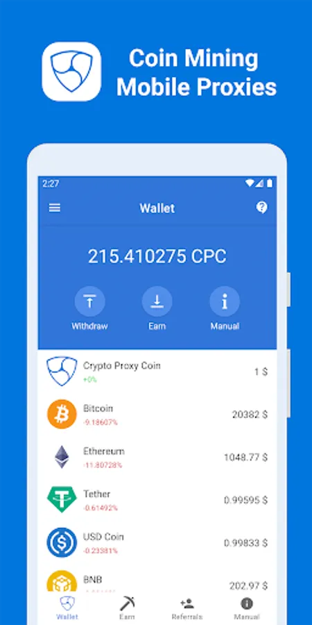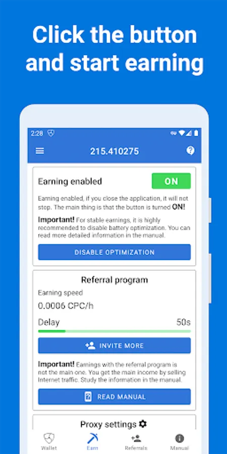 The program makes it possible to mine tokens in the app using a mobile phone. Users get an hourly pay for the proxy. One can use CPC or add funds to the wallet to pay for the proxy.