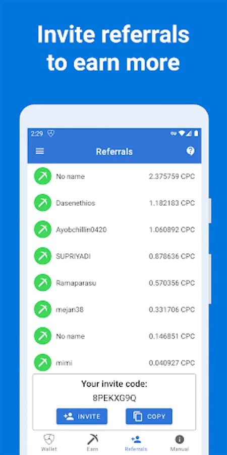 The app implies a referral program. Every new user registered by following the link increases the earning coefficient. In CPC there are 2 earnings levels: