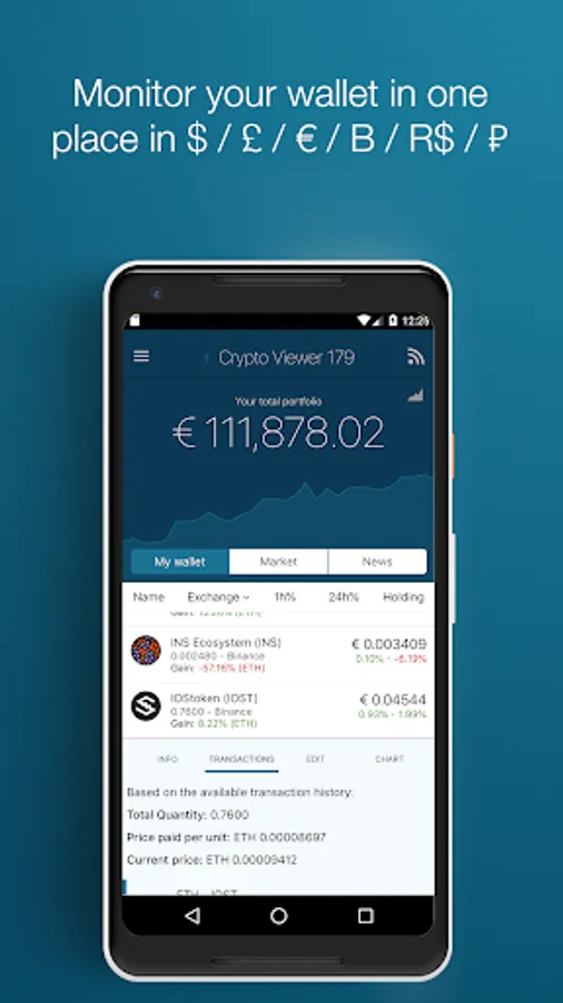 Crypto Viewer allows you to keep track of the value of all your cryptocurrencies (2000+ coins supported) in one place, giving you a total in the currency you choose (BTC/ETH/EUR/GBP/USD/BTC/BRL/MXN/CHF...).