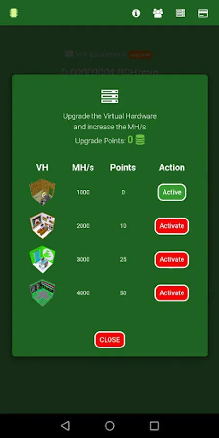 App after start will suggest You to start the mining process (which is the simulation, ie the gameplay), the longer the App runs in the background, the faster You reach the goal (the minimum amount corresponds level, and this is reflected in our simulator), to speed up the mining process can also going more often to the app or inviting your friends (you get extra points).