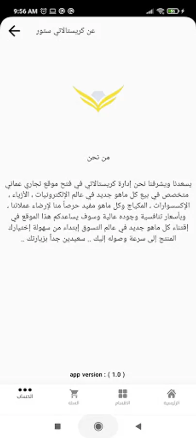 يسعدنا ويشرفنا نحن إدارة كريستالاتي في فتح موقع تجاري عماني متخصص في بيع كل ماهو جديد في عالم الإلكترونيات ، الأزياء ، الإكسسوارات ، المكياج وكل ماهو مفيد حرصاً منا لإرضاء عملائنا ، وبأسعار تنافسية وجوده عالية وسوف يساعدكم هذا الموقع في إقتناء كل ماهو جديد في عالم التسوق إبتداء من سهولة إختيارك المنتج إلى سرعة وصوله إليك .. سعيدين جداً بزيارتك ..
