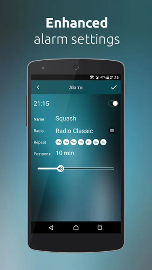 - Multiple and recurring alarms with specified volume, radio station and name,