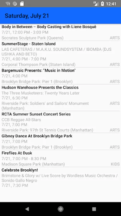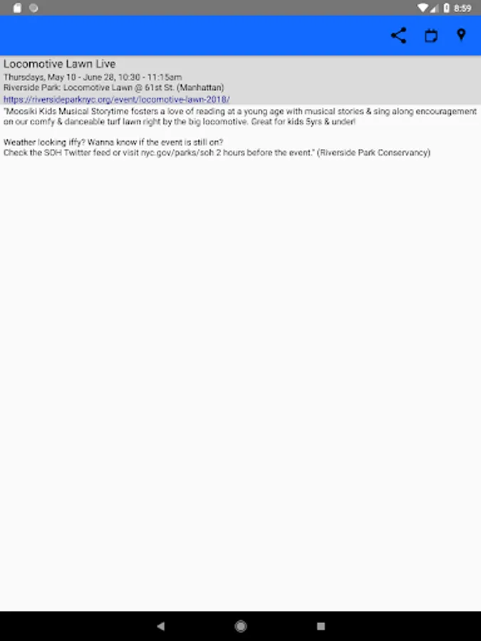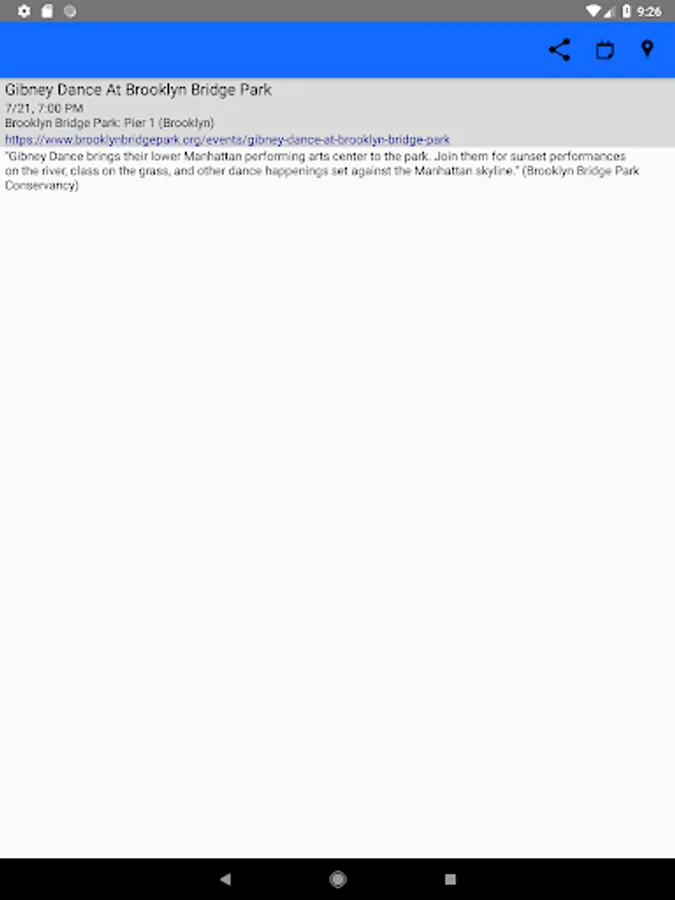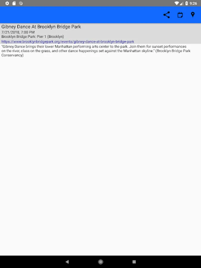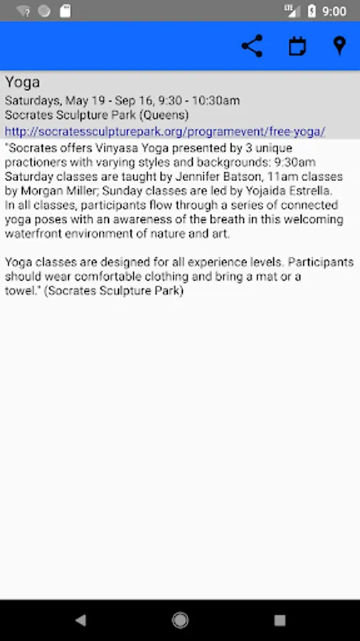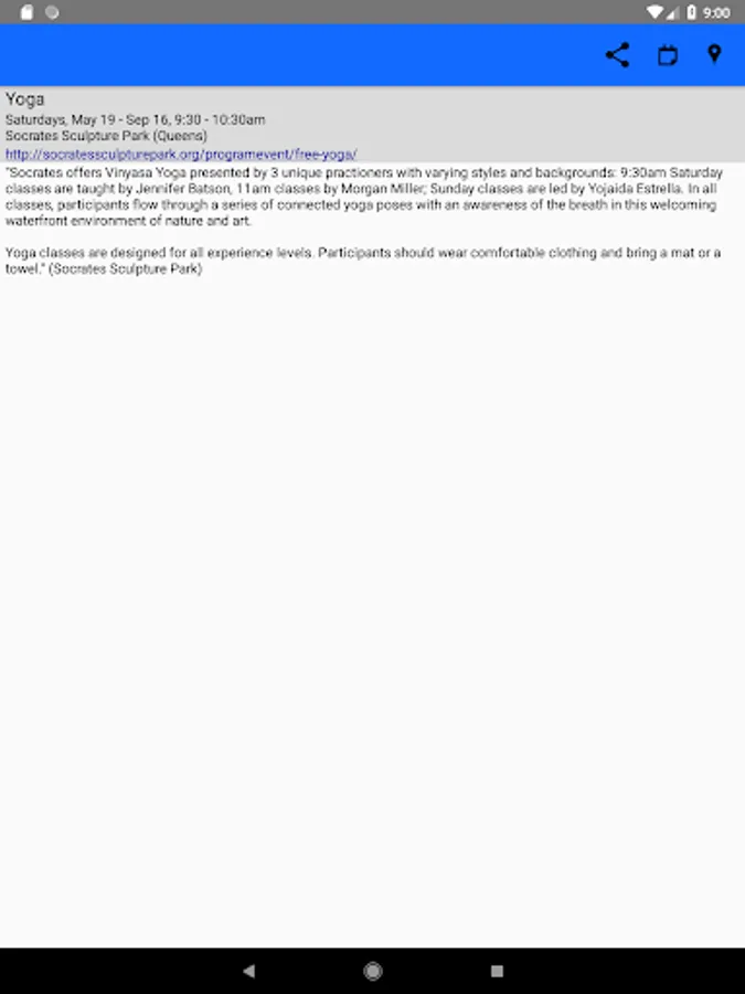 From free concerts in Central Park to early morning yoga in Brooklyn Bridge Park to free juggling lessons in Bryant Park to kids movies on the Hudson River, this app has it all! Easily view events by date or location. When you find an event you like, click a button to share it, add it to your calendar, or show the location on a map.