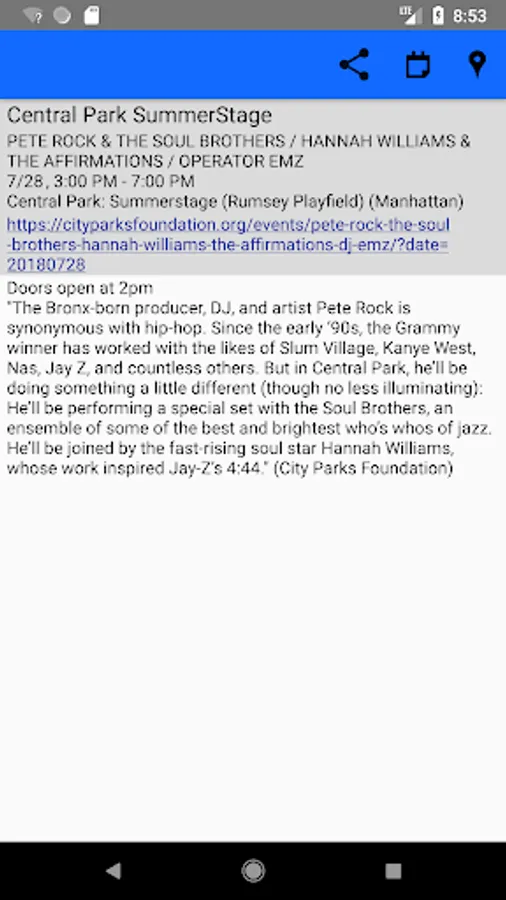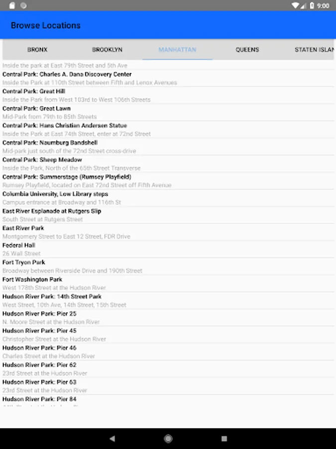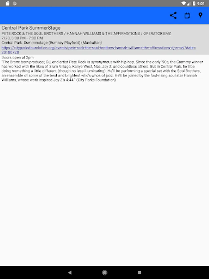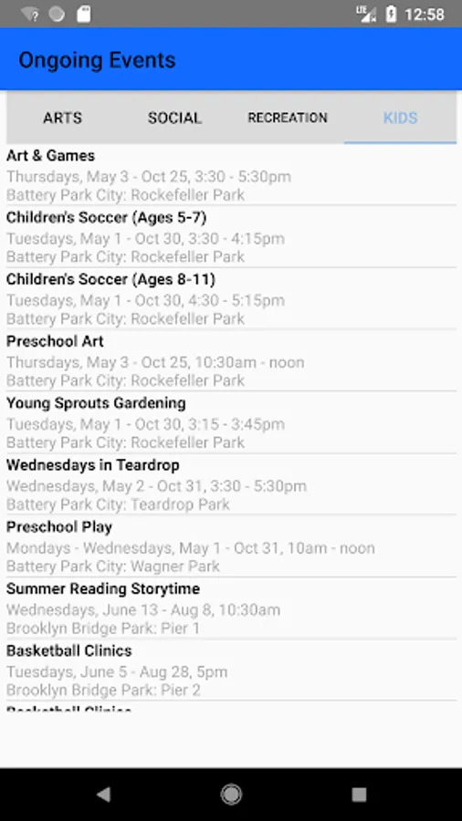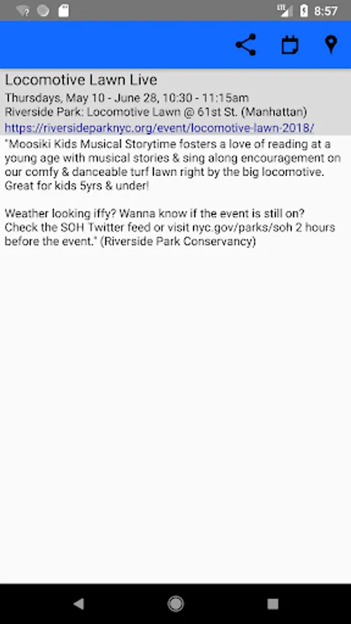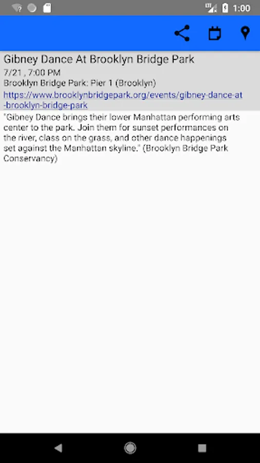 From free concerts in Central Park to early morning yoga in Brooklyn Bridge Park to free juggling lessons in Bryant Park to kids movies on the Hudson River, this app has it all! Easily view events by date or location. When you find an event you like, click a button to share it, add it to your calendar, or show the location on a map.