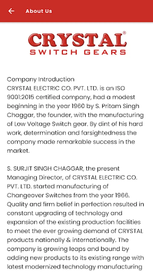 CRYSTAL ELECTRIC CO. PVT. LTD. is an ISO 9001: 2008 certified company, had a modest beginning in the year 1960 with S. Pritam Singh, the founder, with the manufacturing of Low Voltage Switchgears. By dint of his hard work, determination and farsightedness the company made remarkable success in the market.