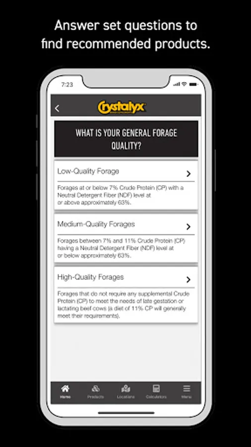• Use as a tool to find the right CRYSTALYX product for your livestock feeding situation based on specie, forage quality and your desired level of fortification